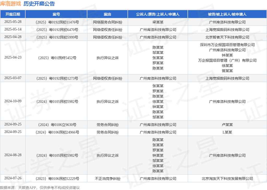 案号:(2025)粤0192民初6470号审理法院:广州互联网法院案由:网络侵权责任纠纷当事人信息: 原告/上诉人:广州库洛科技有限公司 被告/被上诉人:上海宽娱数码科技有限公司开庭日期:2025年5月14日根据统计,近一年内以广州库洛科技有限公司为当事人的历史开庭公告有10则,其中案由为“执行异议之诉”的公告以3则居首,其次为“网络侵权责任纠纷”有3则,“劳务合同纠纷”有2则。历史开庭公告如下: