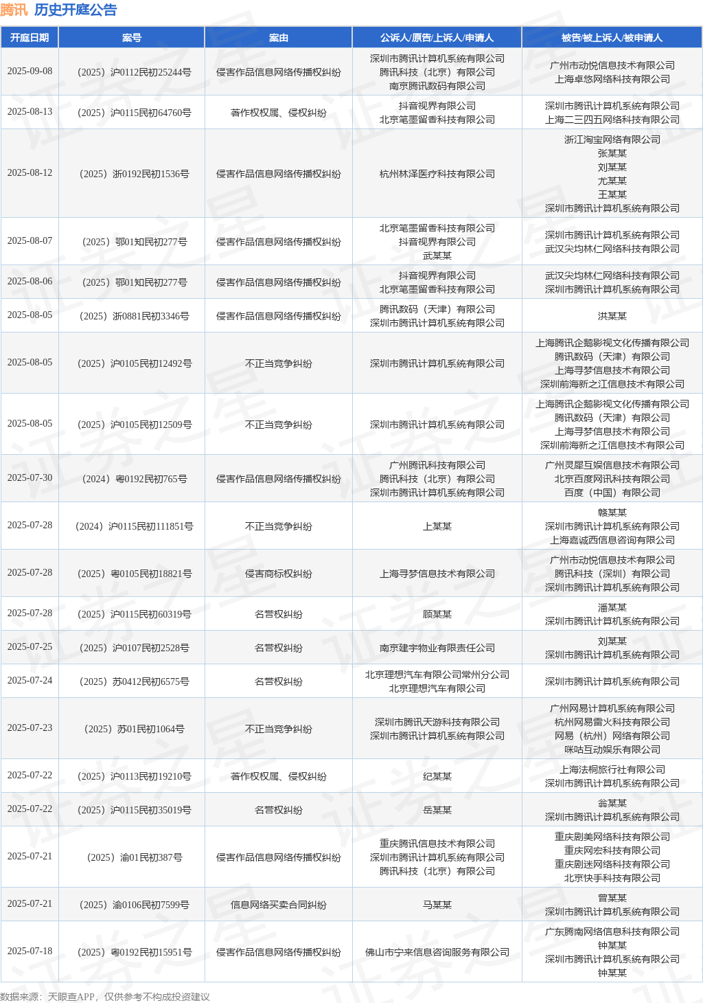 案号:(2025)粤0305民初36388号审理法院:广东省深圳市南山区人民法院案由:著作权权属、侵权纠纷当事人信息: 原告/上诉人:丁某某 被告/被上诉人:深圳市腾讯计算机系统有限公司开庭日期:2025年6月19日根据统计,近一年内以深圳市腾讯计算机系统有限公司为当事人的历史开庭公告有1416则,其中案由为“侵害作品信息网络传播权纠纷”的公告以478则居首,其次为“网络服务合同纠纷”有130则,“著作权权属、侵权纠纷”有129则。历史开庭公告(前20条)如下: